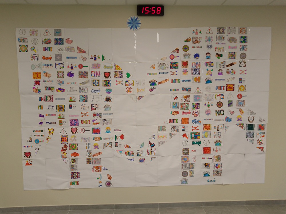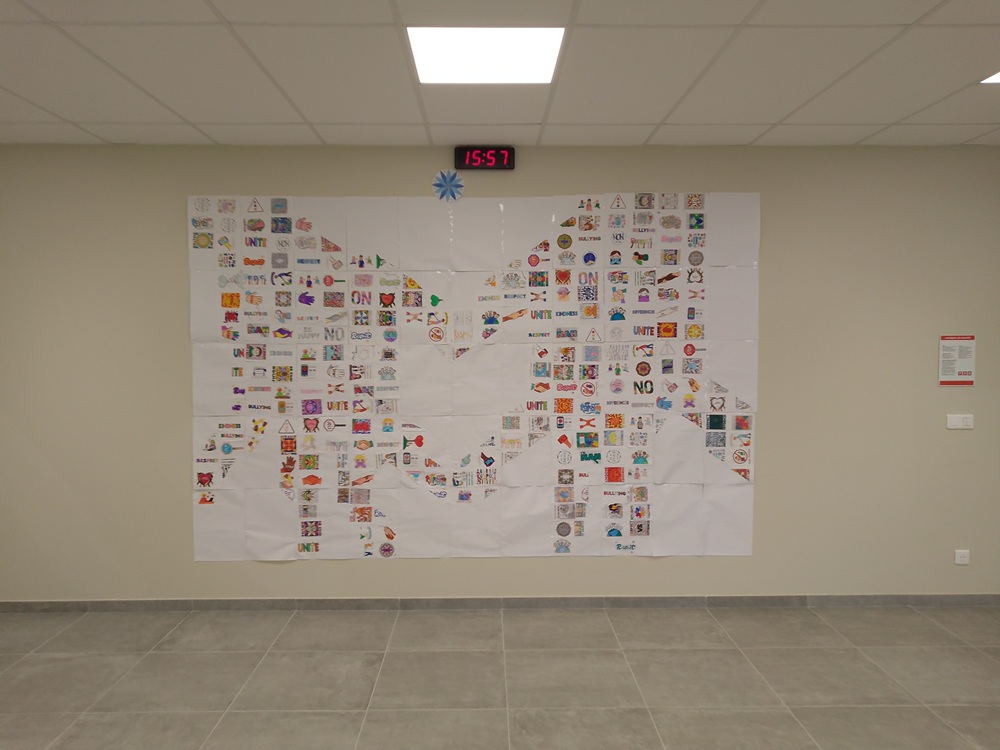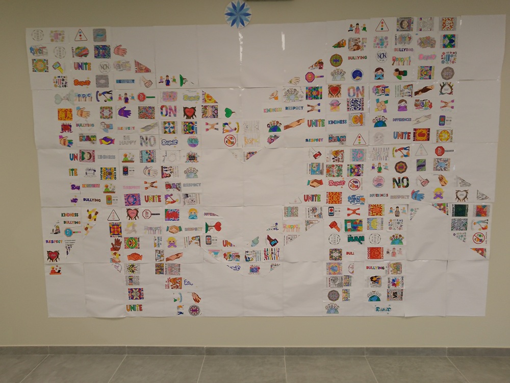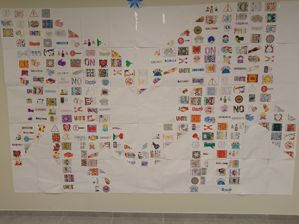 - Sur les temps de vie scolaire, les élèves volontaires ont pu choisir des dessins illustrant la lutte contre le harcèlement et le bien-être à l'école. Ces dessins seront assemblés afin de composer une oeuvre murale géante symbolisant leur engagement dans l'attention portée au harcèlement.